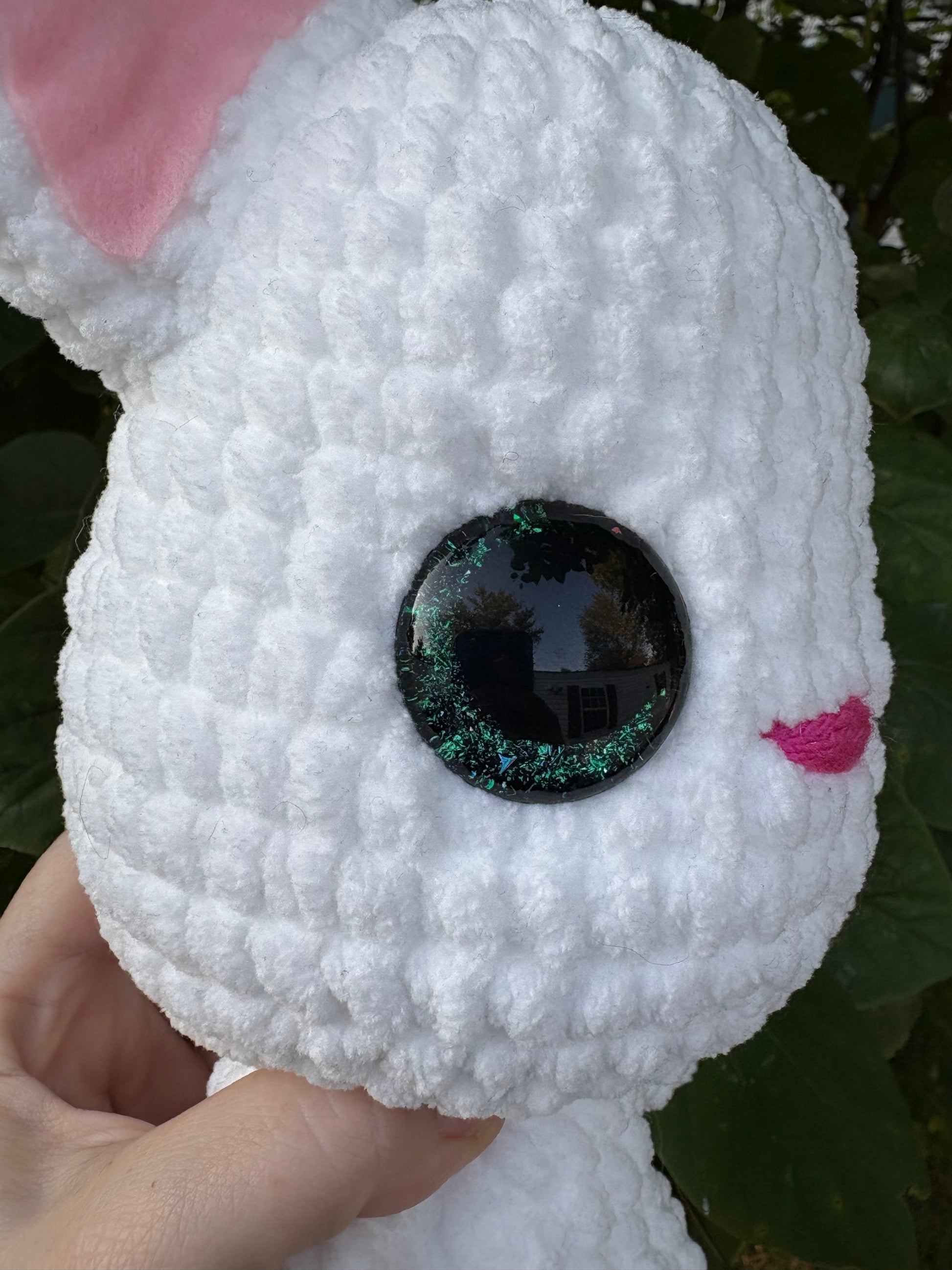 plastic safety eyes, secured inside animal.