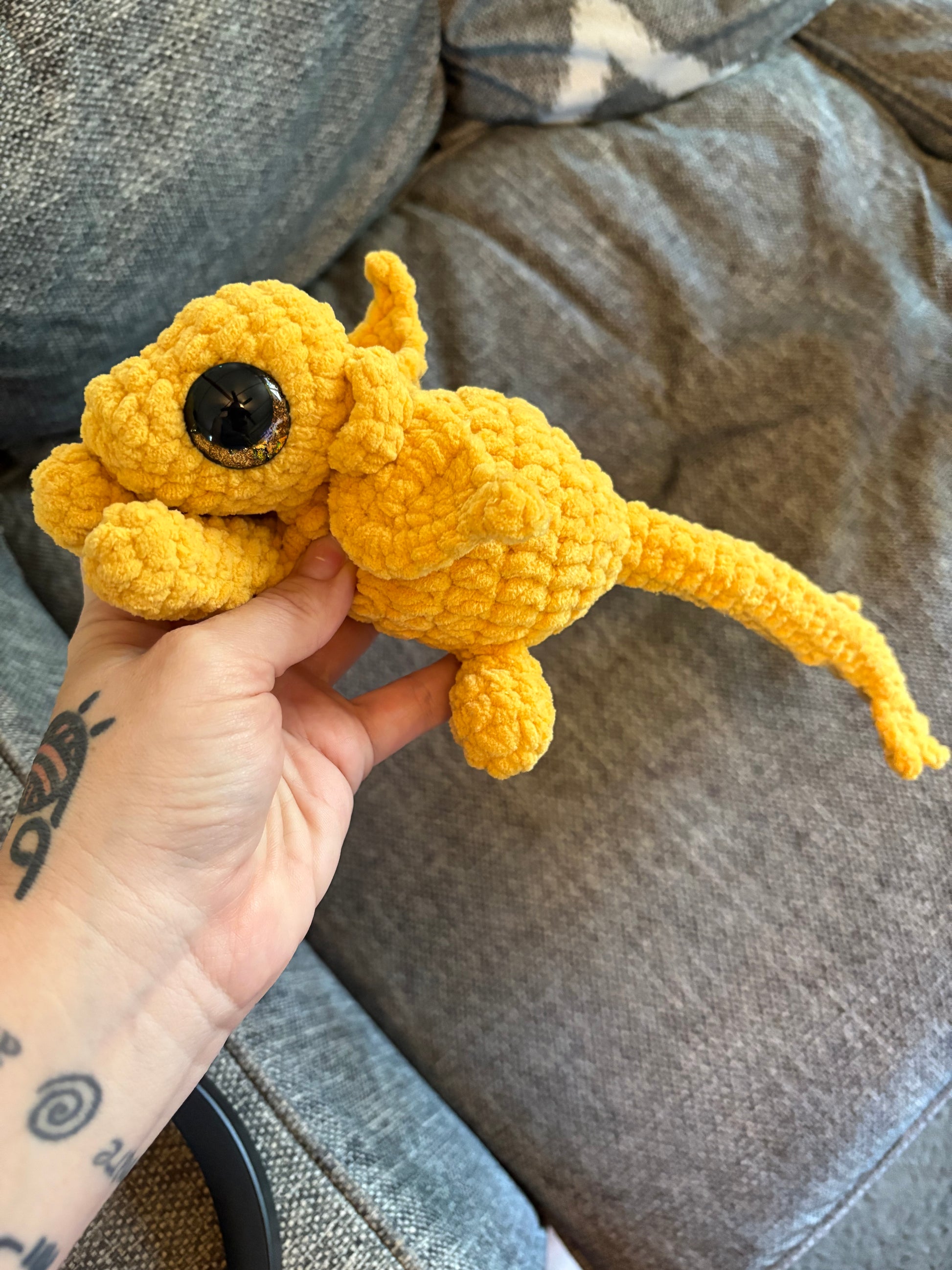 LuvKnotz Medium Yellow ANDARNA FEATHERTAIL Adult Dragon Handmade Crochet - Soft Chenille Yarn, Approx. 4' Long, Hand Painted Eyes, OOAK stuffed animals