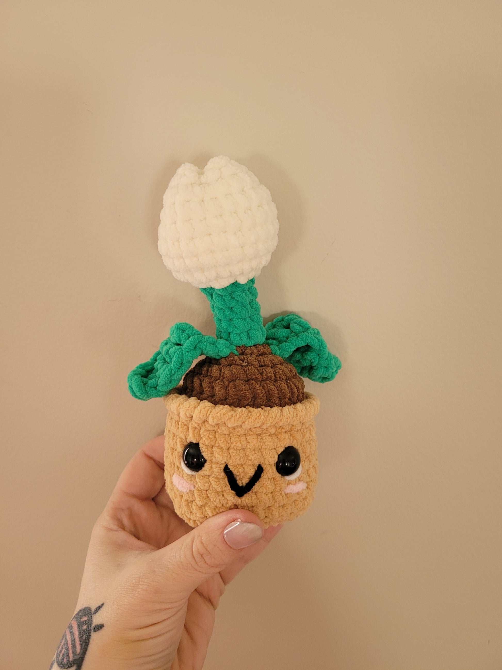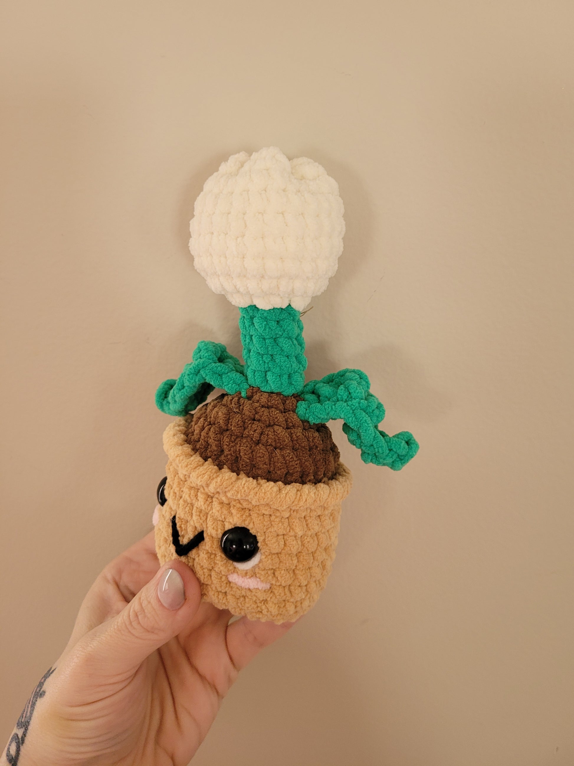LuvKnotz Small White Tulip Flower Creature Handmade Crochet - Soft Chenille Yarn, Approx. 6" tall, OOAK stuffed animals