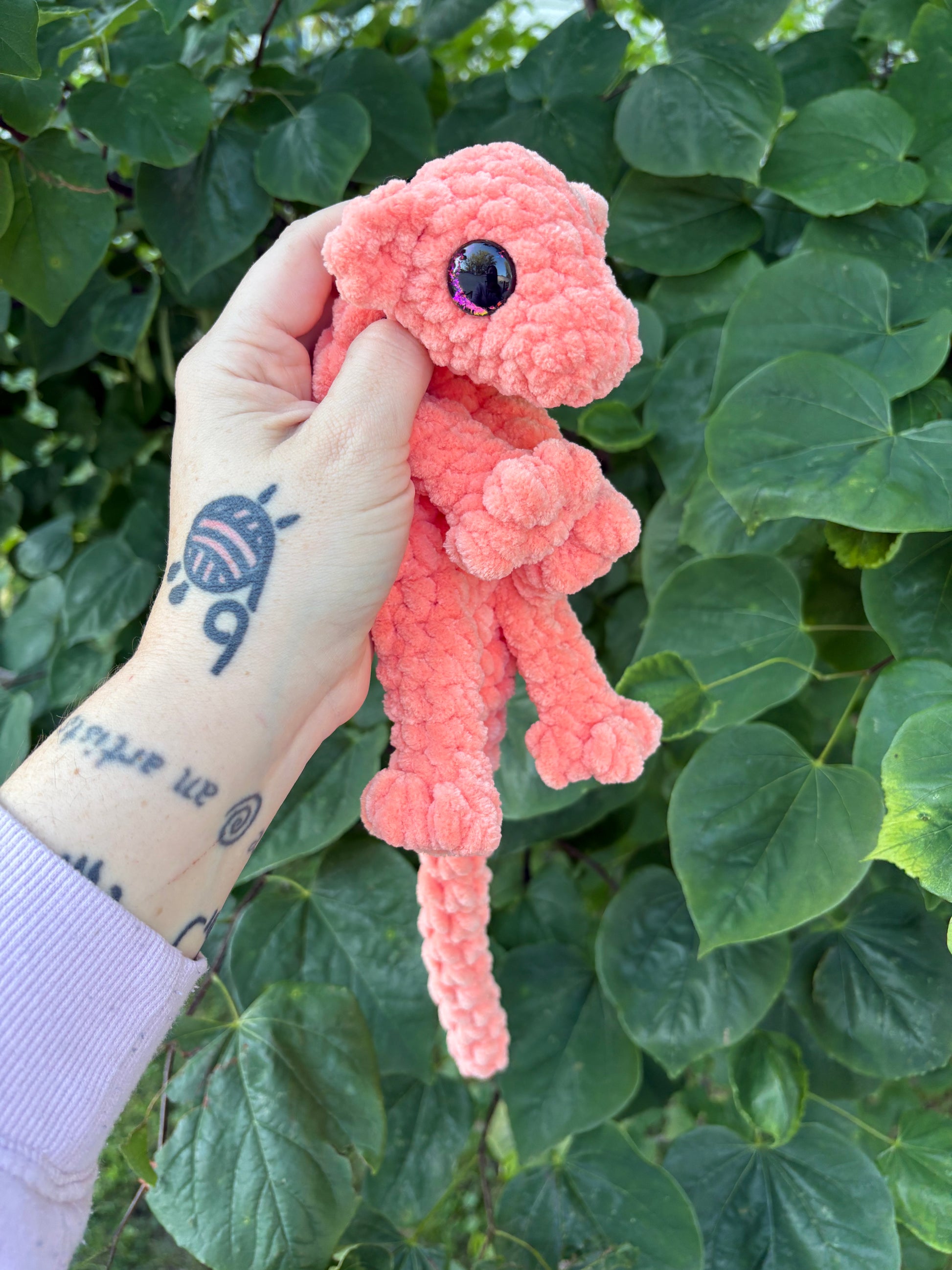 LuvKnotz Small Coral Baby Dragon Handmade Crochet - Soft Chenille Yarn, Approx. 14" Long, Black Orange Pink Eyes, OOAK stuffed animals