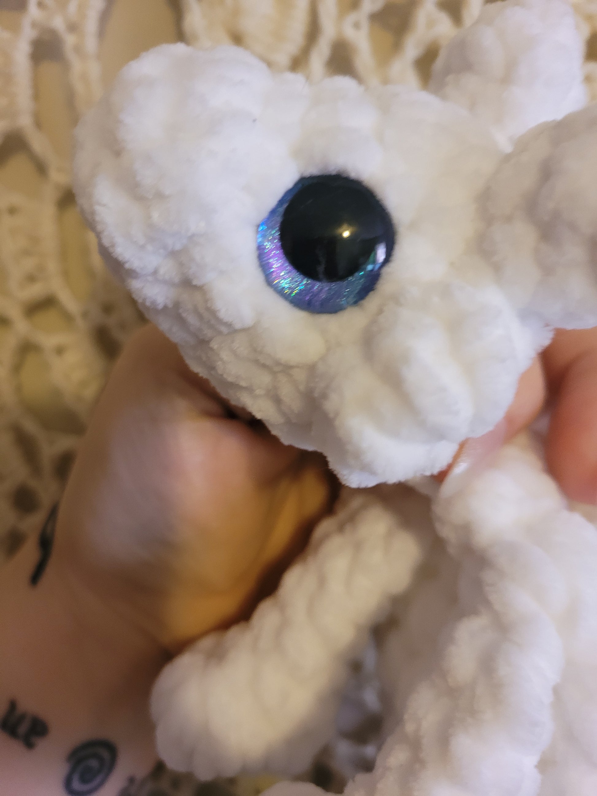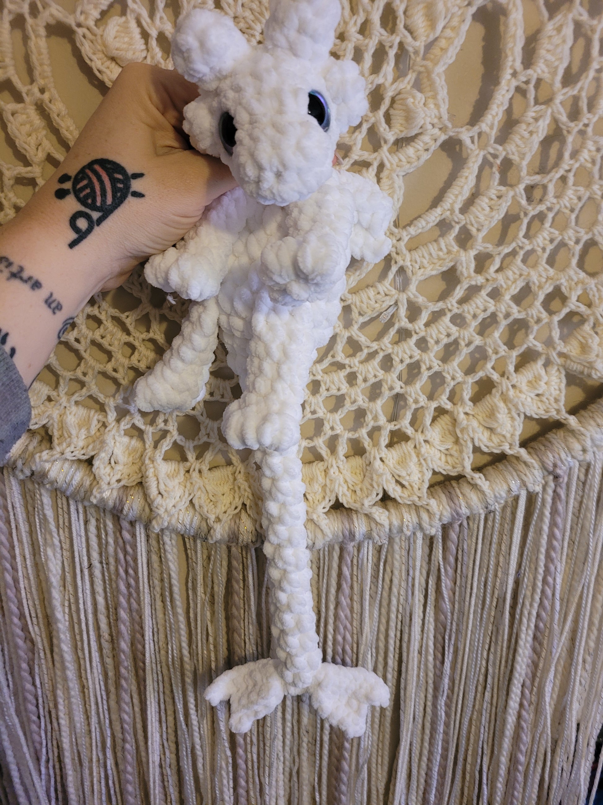 LuvKnotz Small Lightfury White Baby Dragon Handmade Crochet - Soft Chenille Yarn, Approx. 14" Long, Blue Purple Eyes, OOAK stuffed animals