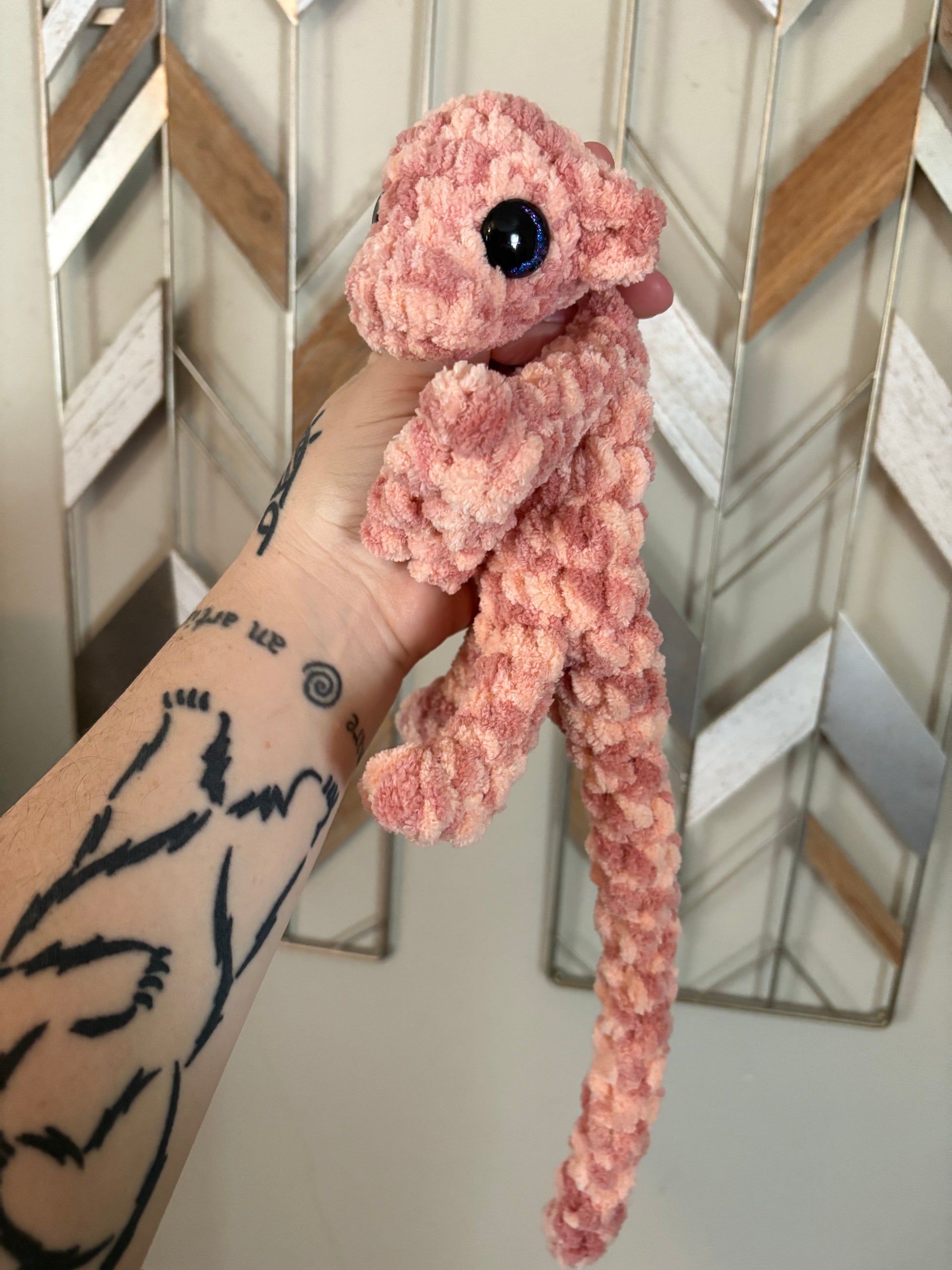 LuvKnotz Small Pink Dappled Baby Dragon Handmade Crochet - Soft Chenille Yarn, Approx. 14" Long, Hand Painted Eyes, OOAK stuffed animals