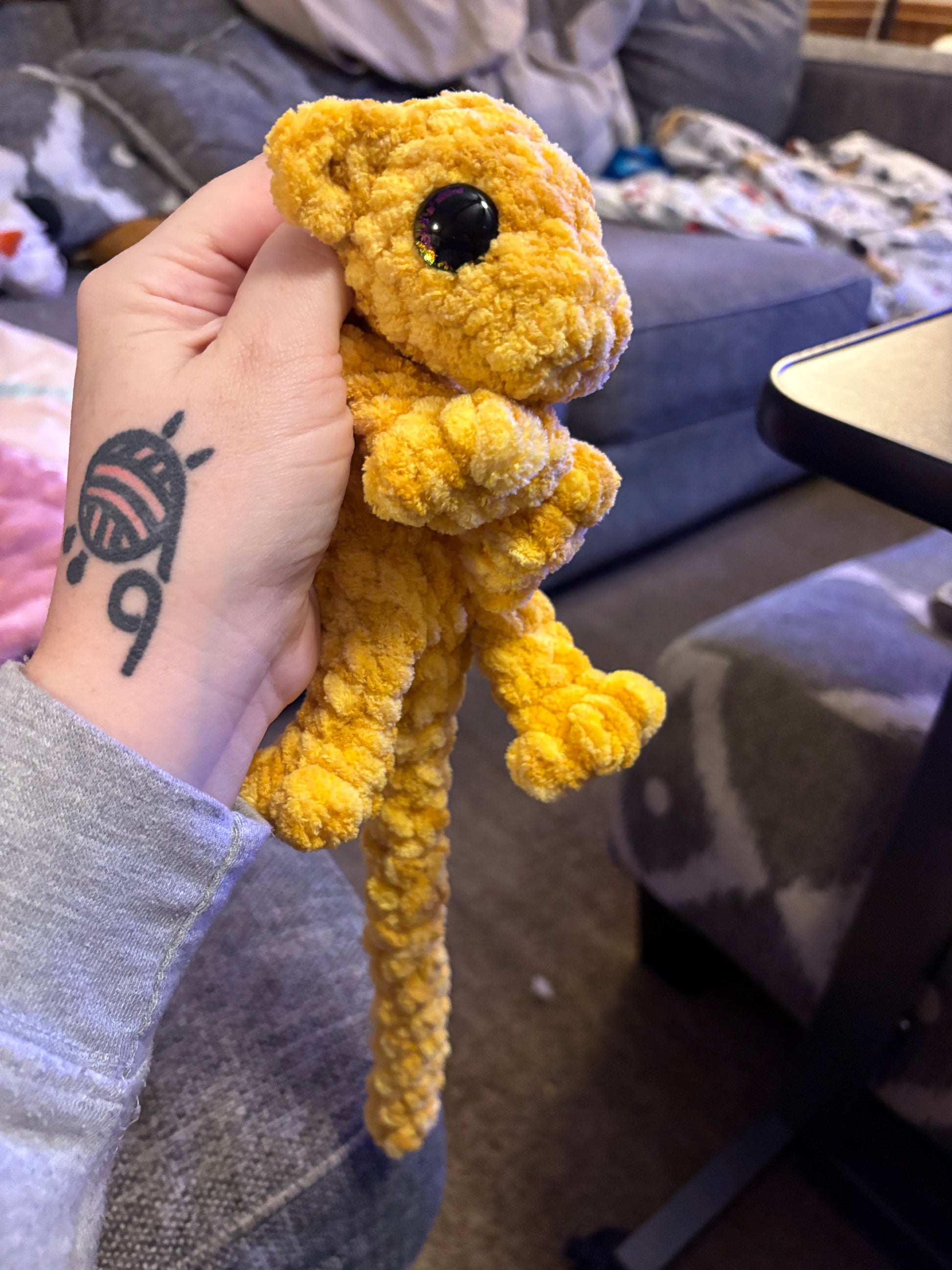 LuvKnotz Small Yellow Dapple Baby Dragon Handmade Crochet - Soft Chenille Yarn, Approx. 14" Long, pink Eyes, OOAK stuffed animals
