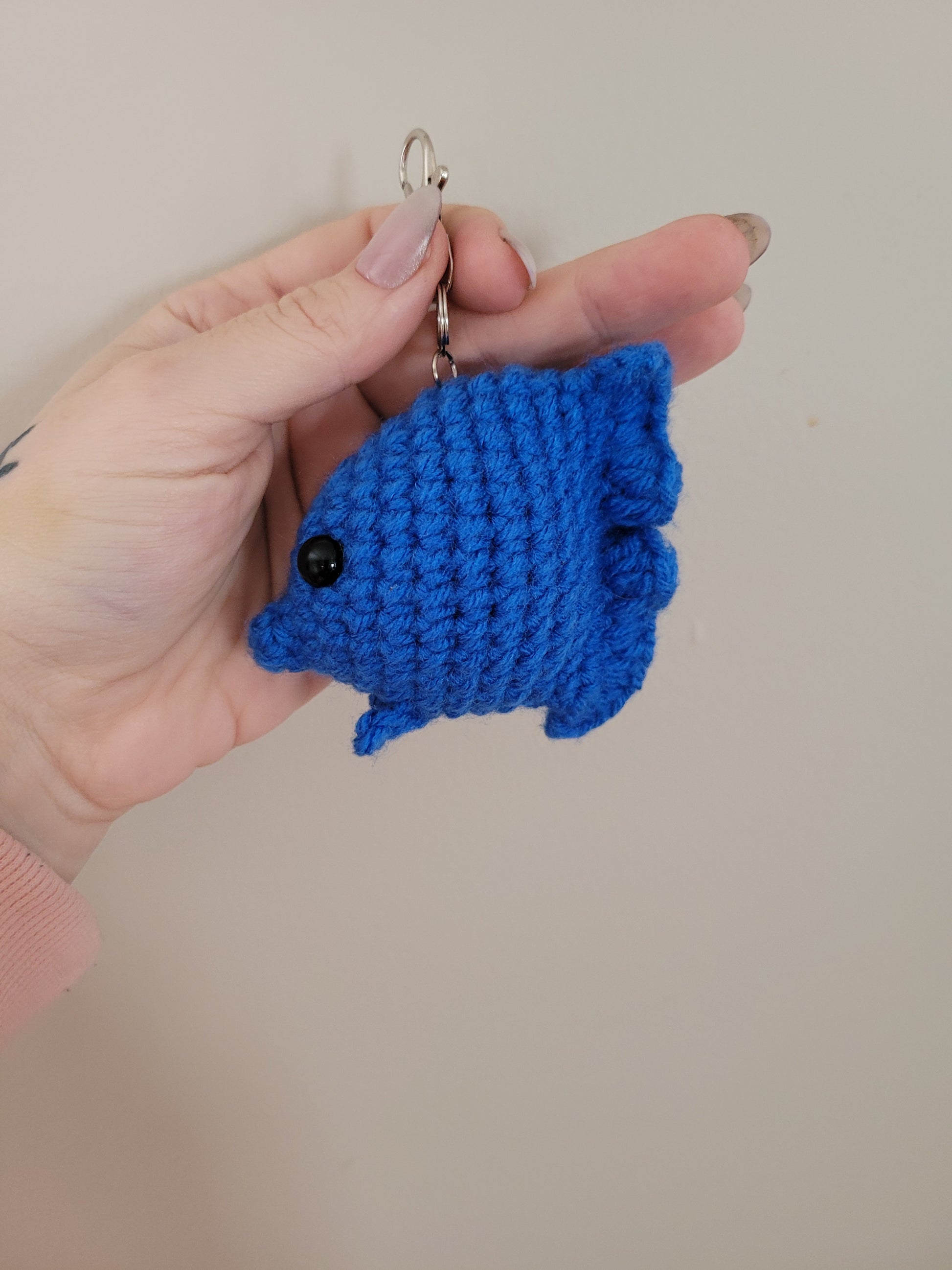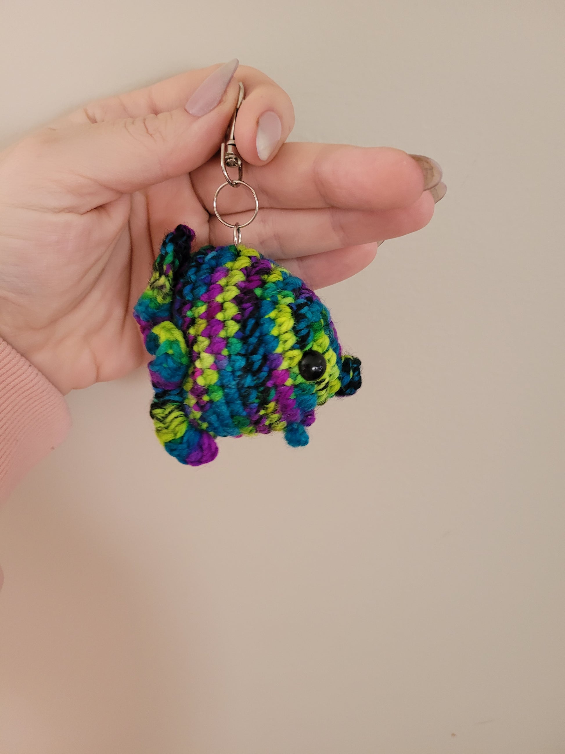 LuvKnotz Tiny Blue Multicolor Keychain Fish Handmade Crochet - Soft Acrylic Yarn, Approx. 3" Long, OOAK stuffed animals